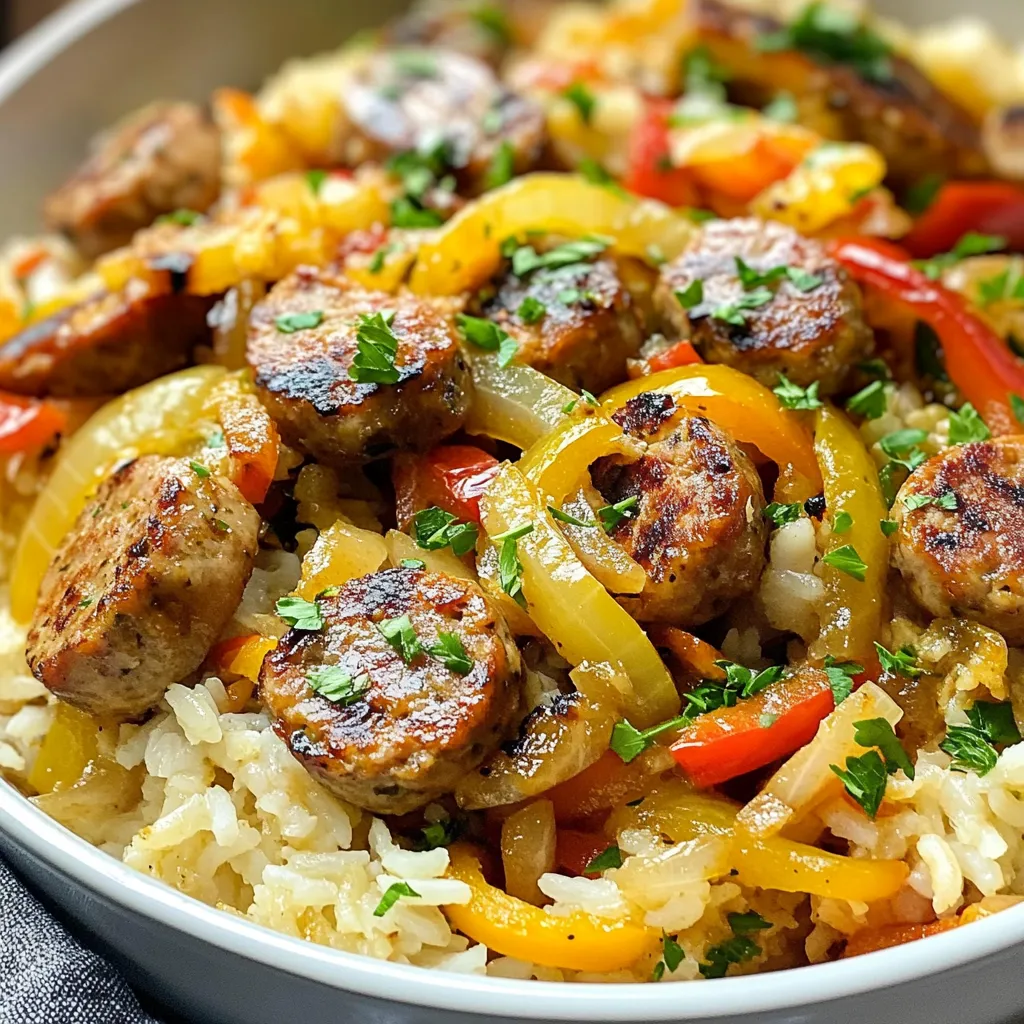 A flavorful one-pan dish featuring chicken sausage, rice, and vegetables, perfect for a quick and satisfying meal.