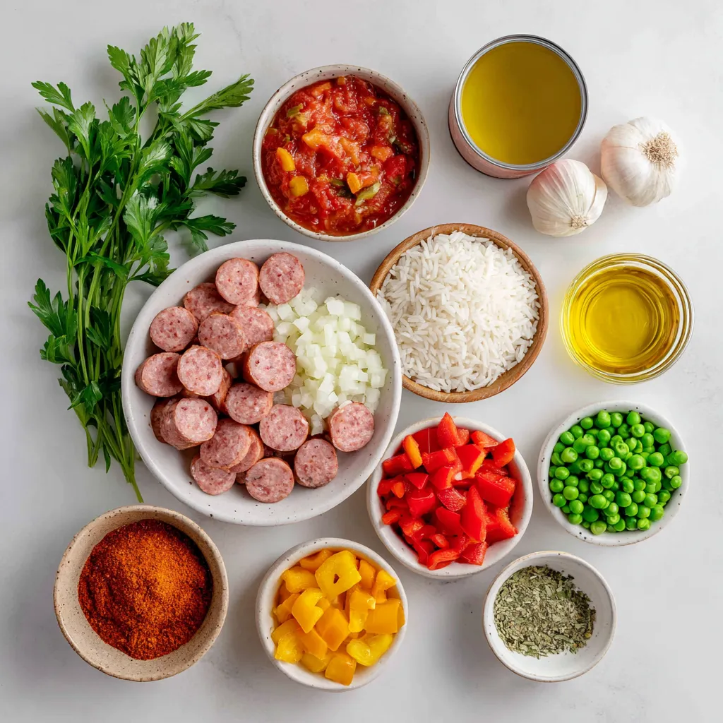Chicken broth adds richness to the rice. Olive oil helps in cooking the sausage and veggies. Frozen peas add a pop of color and sweetness. Fresh herbs like parsley or cilantro brighten the dish when served. These components make this meal hearty and comforting.