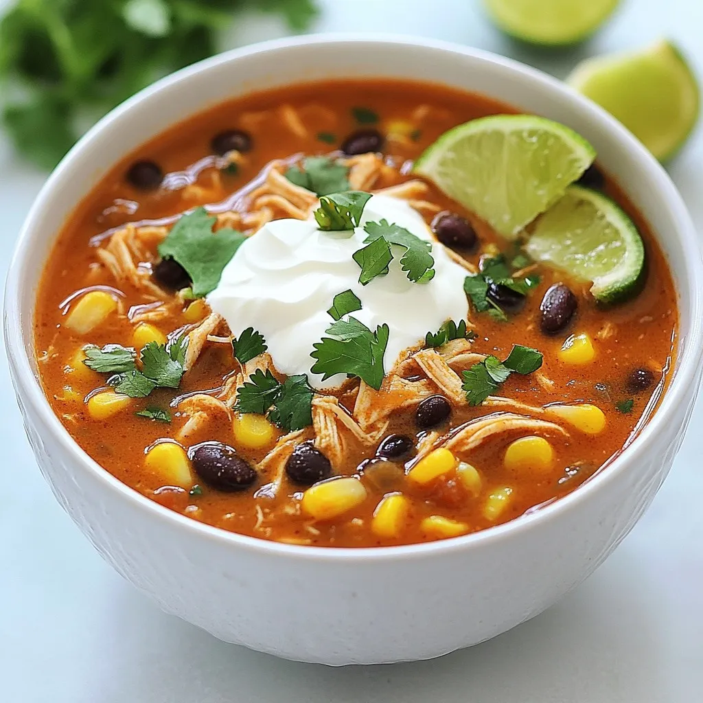 A hearty and flavorful soup featuring chicken, black beans, and corn, topped with cheese and sour cream.