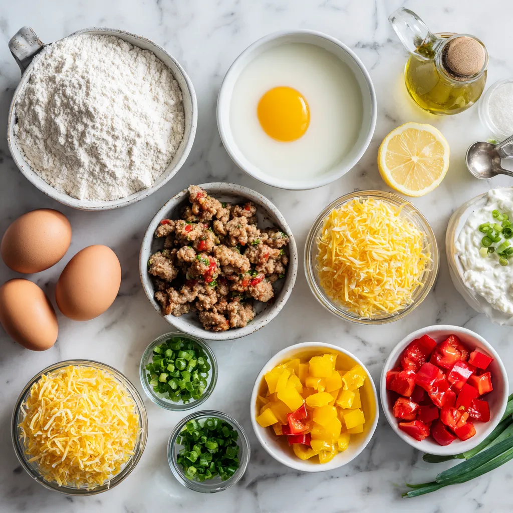 Next, we have our flavorful add-ins. Shredded cheese brings creaminess and richness. Cooked crumbled sausage adds heartiness, but you can swap it for a plant-based option. Bell peppers add color and crunch, while green onions give a fresh bite.