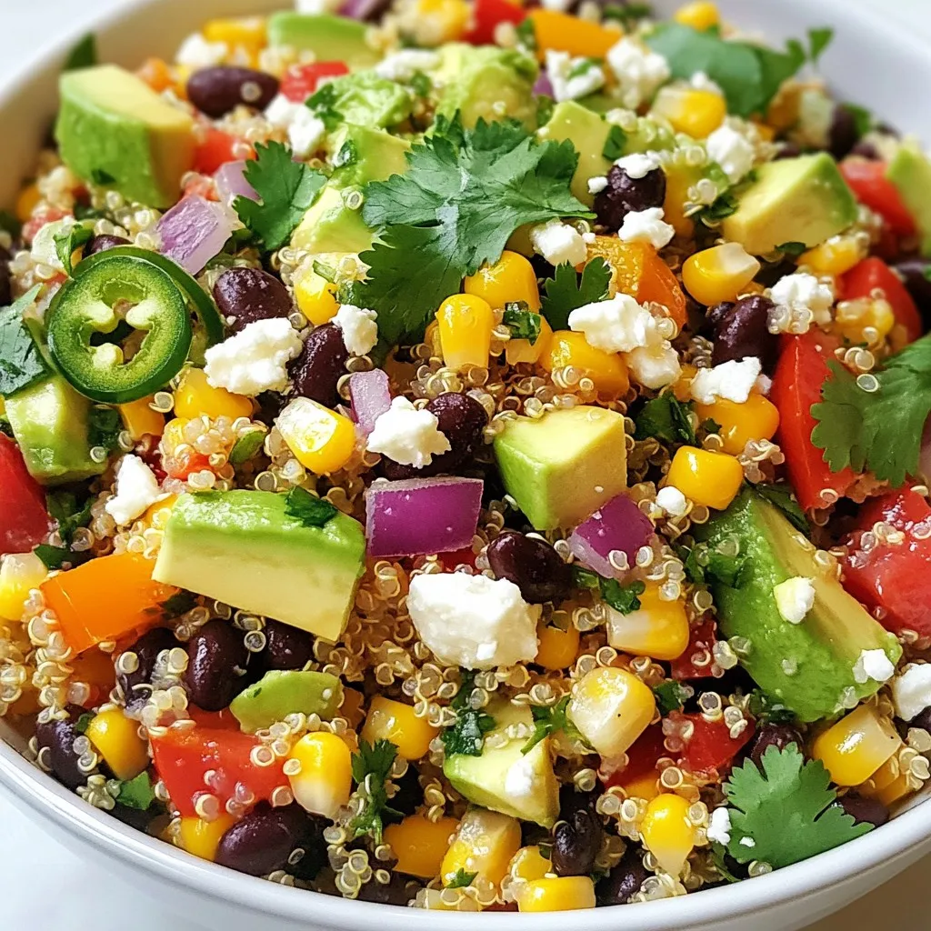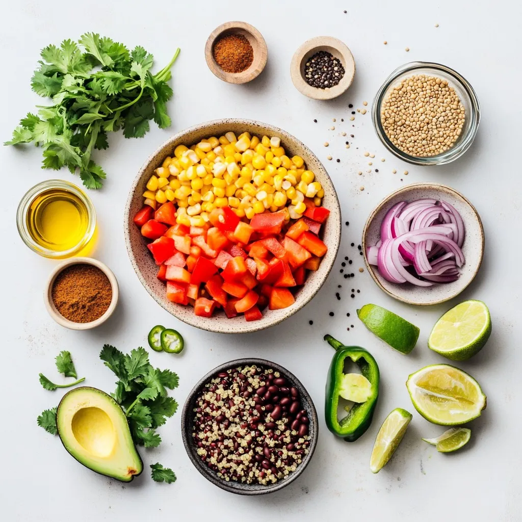 A vibrant and nutritious salad featuring quinoa, black beans, corn, and fresh vegetables, dressed with lime and spices.