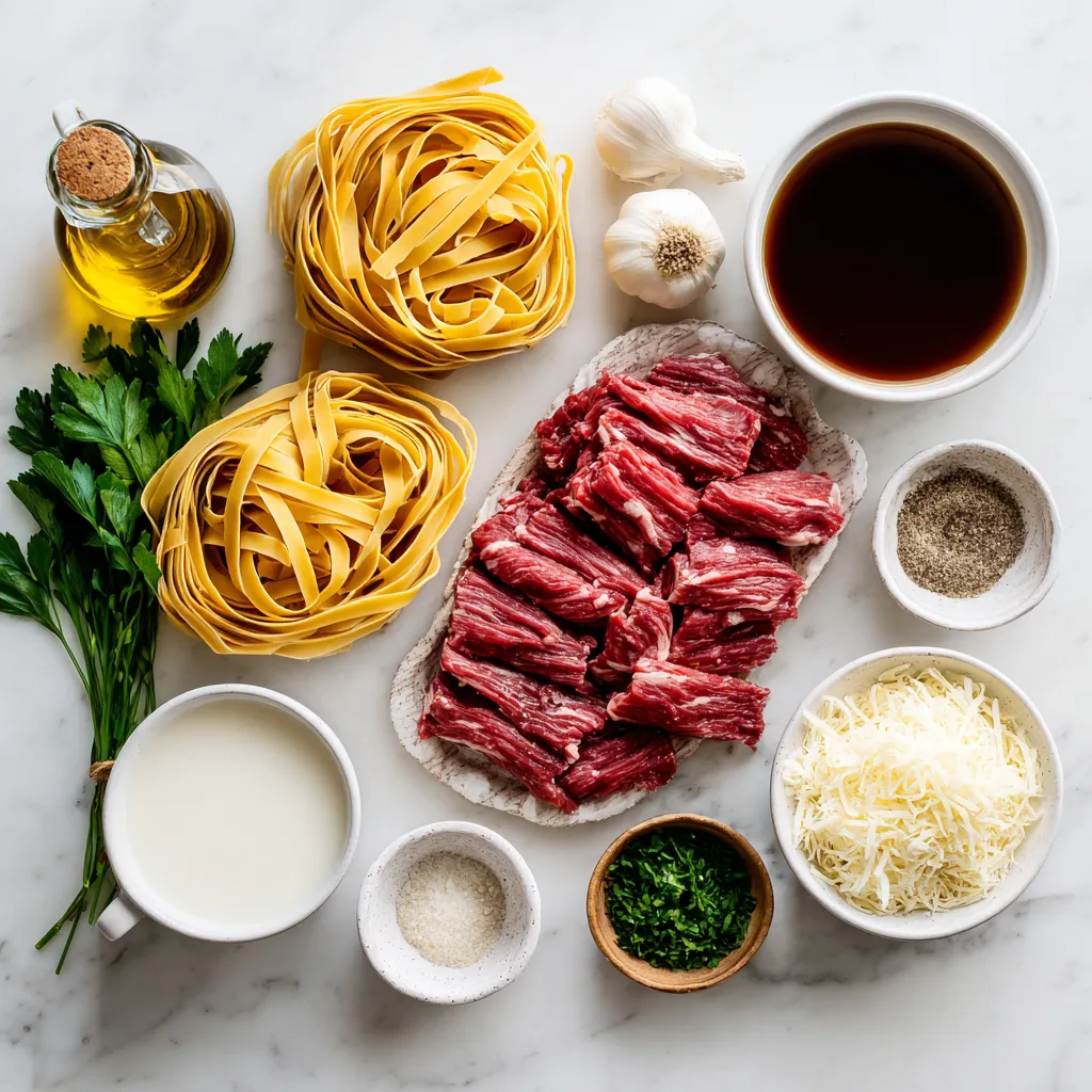 Gather these ingredients to make a hearty and creamy steak pasta dish. Fettuccine provides a nice base. Flank steak offers great flavor and texture. The olive oil helps in cooking the steak and garlic. Fresh garlic adds a warm depth to the sauce. Heavy cream makes the sauce rich and smooth. Beef broth brings a savory touch. Grated Parmesan cheese adds a salty kick. Italian seasoning enhances the overall flavor. Salt and pepper bring balance. Lastly, fresh parsley gives a bright finish.