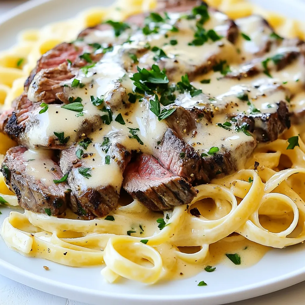 A delicious combination of tender flank steak and creamy fettuccine pasta, garnished with fresh parsley.