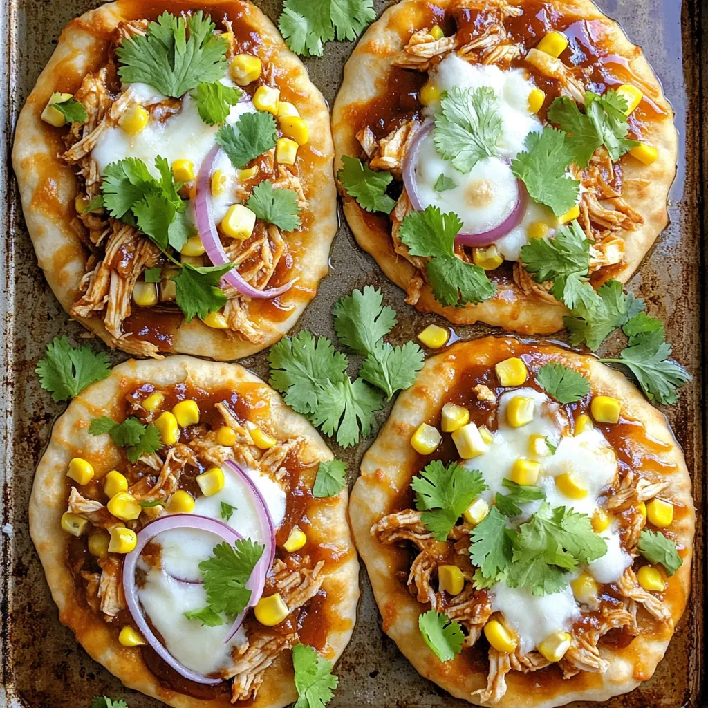Once the baking is done, remove the sheet pan from the oven. Sprinkle chopped cilantro over the hot flatbreads for a fresh touch. Allow them to cool slightly, then slice into pieces. Enjoy your BBQ chicken meal or appetizer warm!