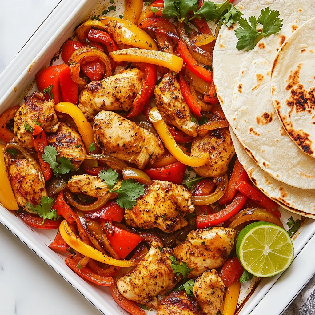 A delicious and easy sheet pan recipe for chicken fajitas with colorful vegetables.