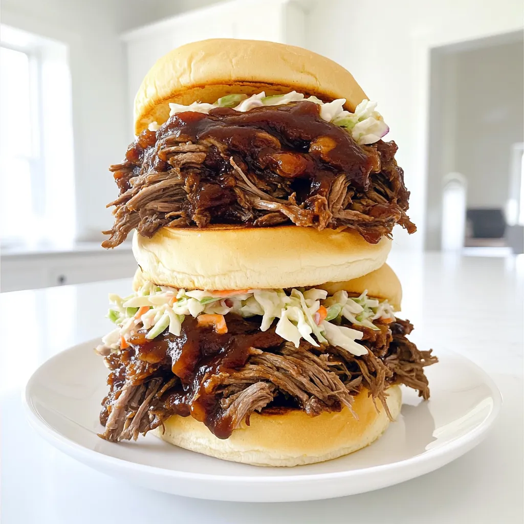 Serve the sandwiches on a wooden board for a nice touch. Place the beef on the bottom half of the roll. Add coleslaw on top for crunch. This adds great flavor and texture. Offer extra BBQ sauce on the side for dipping. Enjoy your tasty sandwiches!