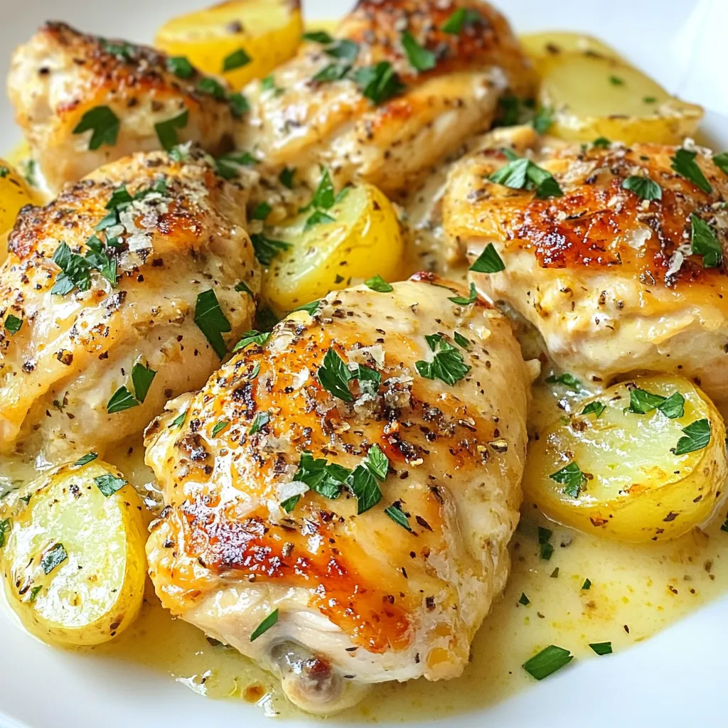 Serve the chicken and potatoes hot. Sprinkle fresh parsley on top for color. You can arrange the chicken on a plate with potatoes beside it. This adds visual appeal. Try using a white plate to help the colors stand out.