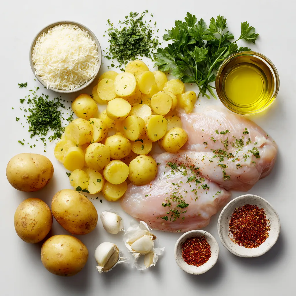 To make this dish, gather these simple ingredients. Each one plays a key role in flavor. The chicken breasts are the main event. They soak up the garlic and cheese flavors beautifully. Baby potatoes add heartiness and texture. Their creamy insides pair well with the chicken.