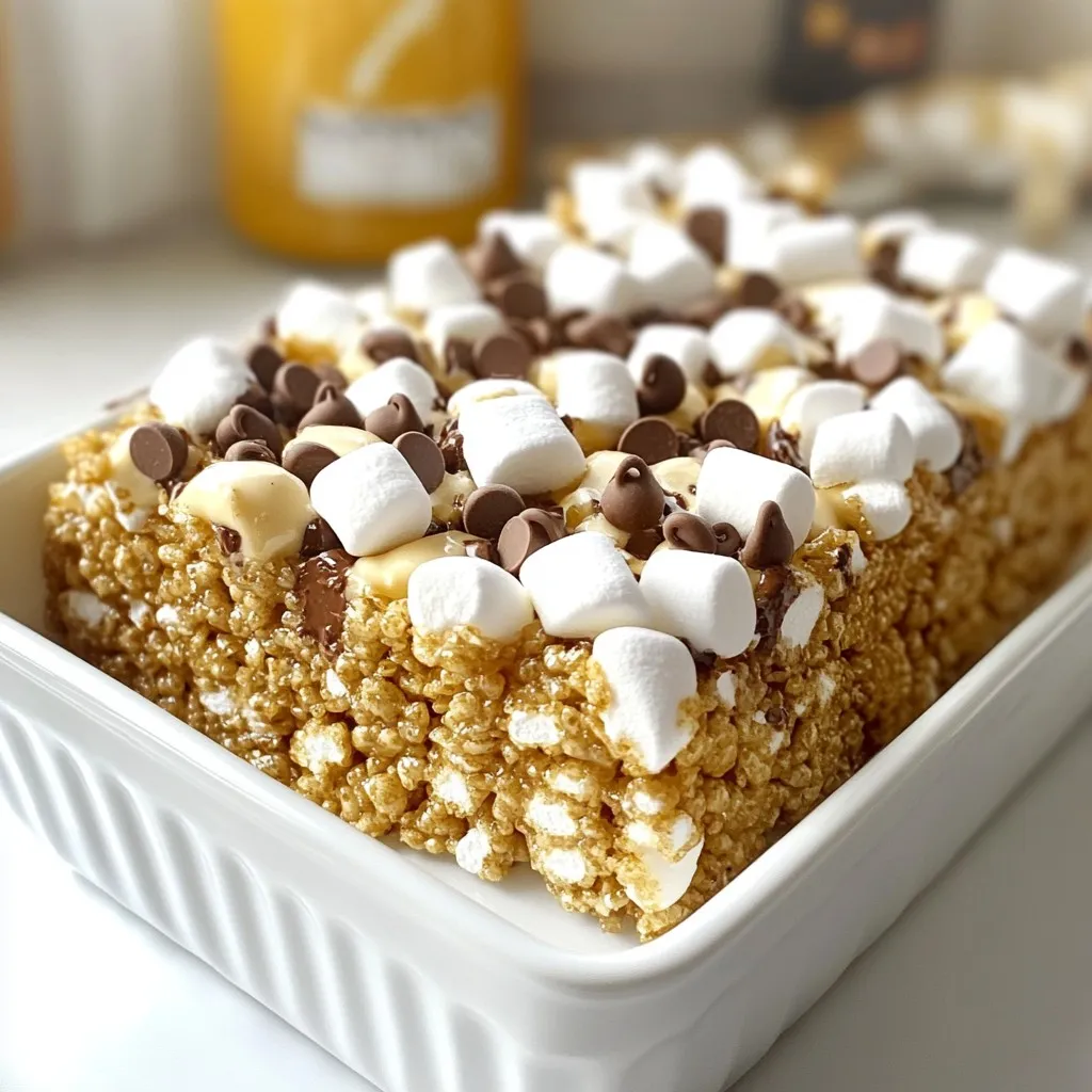 To make S'mores Rice Krispie Treats, you need a few simple ingredients. Here’s what you will need: - 5 cups Rice Krispies cereal - 1 bag (10 oz) mini marshmallows - 1/4 cup unsalted butter - 1 cup graham cracker crumbs - 1/2 teaspoon vanilla extract - 1 cup chocolate chips (semi-sweet or milk chocolate) - Extra mini marshmallows for topping Each ingredient plays a key role. The Rice Krispies give the treats their crunch. Mini marshmallows provide gooey sweetness. Unsalted butter helps bind the mix and adds flavor. Graham cracker crumbs give that classic s'mores taste. Vanilla extract enhances the overall flavor. Chocolate chips add richness, while extra mini marshmallows on top make it extra fun. With these ingredients, you can create a treat that is easy to make and delicious to eat. You will love how they come together! {{ingredient_image_1}} Start by greasing a 9x13 inch baking dish. Use butter or cooking spray so the treats do not stick. This step is key for easy removal later. In a large saucepan, heat the butter over medium heat. Once melted, add the mini marshmallows. Stir continuously until they melt and become smooth. Remove the pan from the heat. This creates a sticky base for your treats. Next, stir in the vanilla extract and graham cracker crumbs. Mix well until everything is combined. The mixture should feel thick and sticky. This gives your treats that classic s'mores flavor. Now, gradually add the Rice Krispies cereal. Stir gently to coat each piece in the marshmallow mix. The mixture should be sticky but hold together well. This step ensures every bite is delicious. Fold in the chocolate chips until they are evenly mixed in. You can save some chips to sprinkle on top. This adds an extra touch of sweetness and looks great too. Transfer the mixture to the prepared baking dish. Press it down firmly using a spatula or parchment paper. Sprinkle extra mini marshmallows and reserved chocolate chips on top. Allow the treats to cool for about 30 minutes. Once set, cut them into squares or rectangles. Enjoy the sweet and gooey goodness! To melt marshmallows well, use low heat. Start with the butter in your pan. Stir it until it melts. Then add mini marshmallows. Keep stirring until they are smooth. This helps avoid burning. If the mixture is too sticky, add a little more butter. The right texture is key for S'mores Rice Krispie Treats. Mix the marshmallow and cereal well. The mix should be sticky but not too wet. If it feels dry, you can add a bit of melted butter. Press the mixture firmly into the pan. This helps it hold its shape when cooled. Some tools make this recipe easier. A large saucepan is a must for melting. Use a spatula to mix the ingredients. A 9x13 inch baking dish works great for shaping. Parchment paper can help with easy cleanup. If you have a butter spray, use it to grease the pan. This prevents sticking and makes serving simpler. Pro Tips Use Fresh Ingredients: Always use fresh mini marshmallows and chocolate chips for the best flavor and texture in your treats. Don’t Overheat the Marshmallows: Melt the marshmallows gently over medium heat to avoid burning, which can change the flavor. Press Firmly: When pressing the mixture into the baking dish, use a spatula or your hands (dampened with water) to ensure a compact layer that holds together well. Storage Tips: Store your S'mores Rice Krispie Treats in an airtight container to keep them fresh and chewy for longer. {{image_2}} You can make these treats even tastier by adding nut butter. Peanut butter or almond butter works well. Just stir in about 1/2 cup of your favorite nut butter when you melt the marshmallows. This adds a rich flavor and a creamy texture. Plus, it gives a nice twist to the classic S'mores taste. Feel free to switch up the chocolate! Dark chocolate, white chocolate, or even flavored chocolate can change the whole vibe. Use the same amount, about 1 cup, for a new taste. Mixing chocolates can also create a fun marble effect. Don’t be afraid to experiment with chocolate combinations to find your perfect mix. You can add more goodies to your S'mores Rice Krispie Treats. Chopped nuts like pecans or walnuts add crunch. You can also add dried fruit, like cherries or cranberries, for sweetness. Just remember to keep the total mix at about 1 to 1.5 cups. This way, you keep the treats balanced and delicious! To keep your S'mores Rice Krispie Treats fresh, store them in an airtight container. This helps prevent them from getting hard or stale. You can stack them in layers. Just place parchment paper between layers to avoid sticking. These treats taste best within the first week. However, you can keep them in a cool, dry place. Avoid storing them in the fridge, as this can make them too hard. If you notice any signs of dryness, add a slice of bread to the container. The bread will help them stay soft. You can freeze S'mores Rice Krispie Treats if you want to save some for later. Wrap each piece tightly in plastic wrap. Then, place the wrapped pieces in a freezer bag. They can last up to three months in the freezer. When you are ready to enjoy them, let them thaw at room temperature. To make S'mores Rice Krispie Treats, start by greasing a 9x13 inch baking dish. In a large saucepan, melt 1/4 cup of unsalted butter over medium heat. Add 10 oz of mini marshmallows and stir until they melt completely. Remove from heat, then mix in 1/2 teaspoon of vanilla extract and 1 cup of graham cracker crumbs. Gently fold in 5 cups of Rice Krispies cereal, followed by 1 cup of chocolate chips. Press the mixture into the baking dish and top with extra mini marshmallows. Let it cool for about 30 minutes before cutting into squares. Yes, you can use homemade marshmallows! Just ensure they are soft and sticky. This will help them blend well with the butter. Homemade marshmallows can add a fresh flavor to your treats. However, the texture may differ slightly from using store-bought mini marshmallows. Yes, S'mores Rice Kri