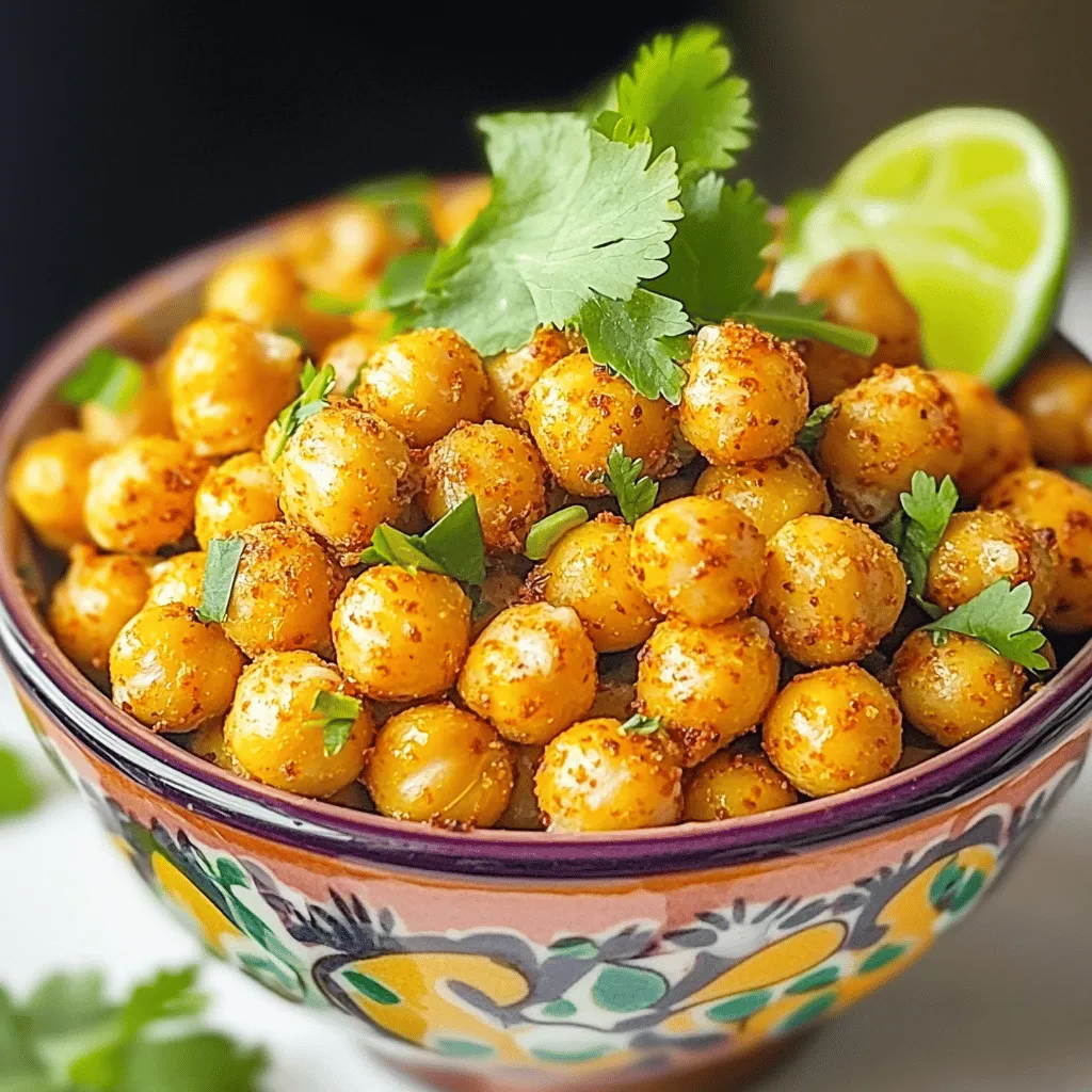 Now, take your dried chickpeas and add them to the spice blend. Toss them around until they are well coated. Spread the chickpeas out on a baking sheet lined with parchment paper. Make sure they are in a single layer for even roasting. Roast them in the oven for 25 to 30 minutes. Halfway through, shake the pan to help them crisp. Once they are golden and crunchy, take them out. Let them cool for a bit. Drizzle with fresh lime juice and garnish with cilantro. Enjoy your crunchy snack!