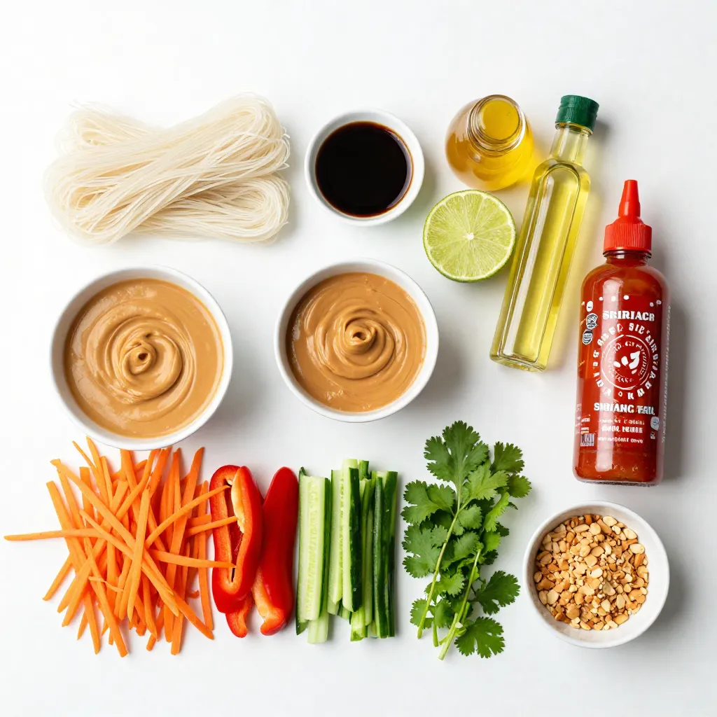 To make Spicy Thai Peanut Noodles, gather your main ingredients first. Start with rice noodles, creamy peanut butter, soy sauce, lime juice, and honey. These five items are key to a rich flavor.