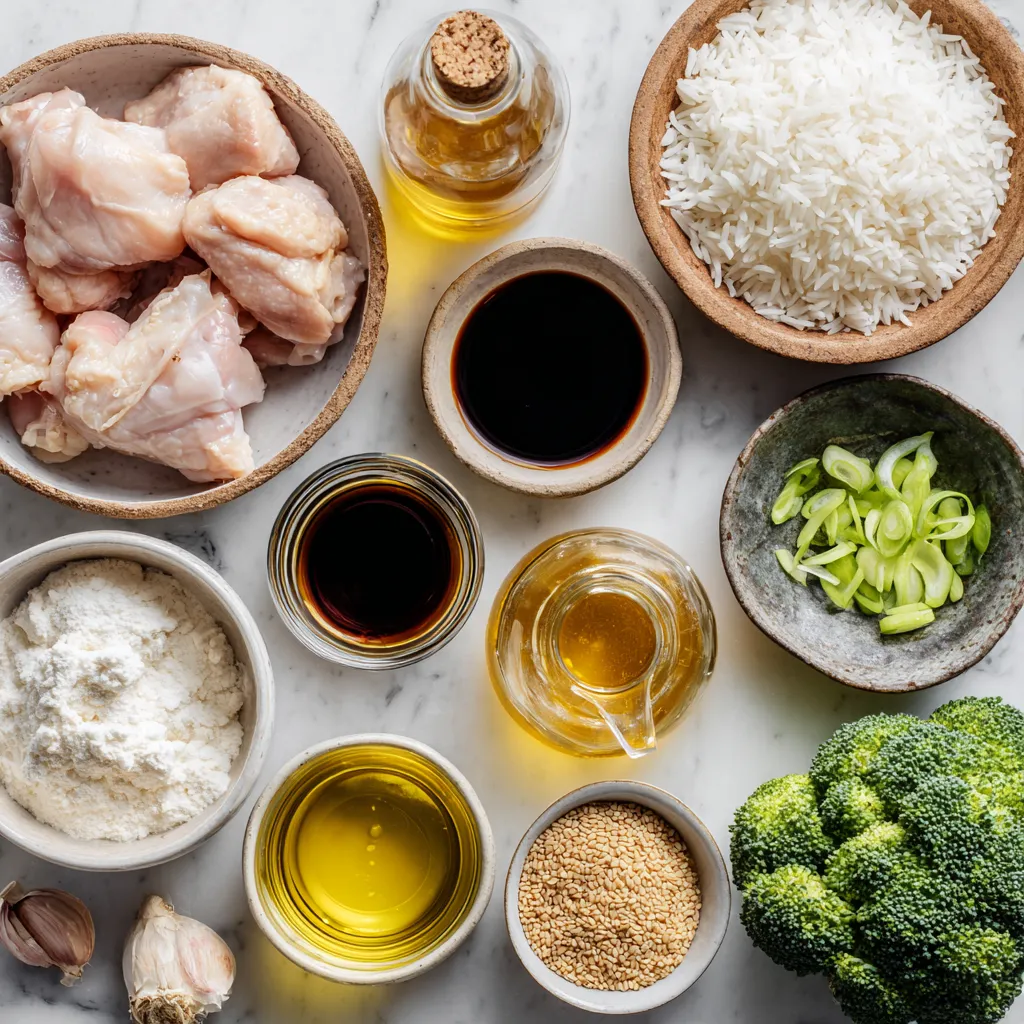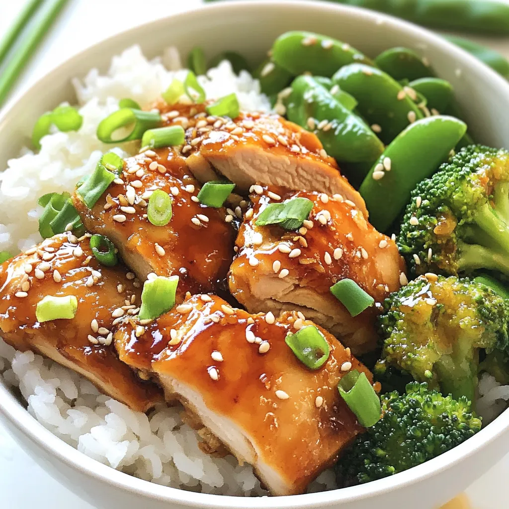 - 2 cups jasmine rice - 4 boneless, skinless chicken thighs - 1/4 cup soy sauce (low sodium) - 2 tablespoons honey - 2 tablespoons sesame oil - 1 tablespoon rice vinegar - 2 garlic cloves, minced - 1-inch piece of ginger, grated - 1 tablespoon cornstarch - 1 cup chicken broth - 1/2 cup sliced green onions - 1/4 cup sesame seeds - Optional: Steamed broccoli or snap peas Gather these ingredients before you start cooking. Each item plays a key role. The jasmine rice provides a fluffy base. The chicken thighs add rich flavor and texture. The soy sauce and honey create a sweet and salty glaze. Sesame oil adds depth, while rice vinegar gives a nice tang. Garlic and ginger bring warmth to the dish. Cornstarch helps thicken the sauce. Green onions and sesame seeds are perfect for garnishing. You can include steamed broccoli or snap peas for added color and nutrients. This combination makes the sticky chicken rice bowls both tasty and visually appealing. {{ingredient_image_1}} - Rinse rice until clear. - Cook rice with water or chicken broth. To start, I rinse the jasmine rice under cold water. This step washes away any excess starch. You want the water to run clear. After rinsing, I cook the rice as per the package directions. You can use plain water or chicken broth for added flavor. Once done, I set the rice aside. - Mix soy sauce, honey, sesame oil, rice vinegar, garlic, ginger, salt, and pepper. - Marinate the chicken. Next, I prepare the marinade for the chicken. In a bowl, I combine soy sauce, honey, sesame oil, and rice vinegar. I also add minced garlic, grated ginger, salt, and pepper. This mix creates a tasty base. I coat the chicken thighs in this marinade. I let them soak for at least 30 minutes. For even deeper flavor, you can marinate them for up to 2 hours. - Sear chicken thighs in a pan. - Let rest before slicing. After marinating, I heat a large pan over medium heat. I take the chicken thighs out of the marinade, saving that sauce for later. I place the chicken in the hot pan. It cooks for about 5-6 minutes on each side until golden brown. Once cooked, I remove the chicken and let it rest for a few minutes before slicing it. - Thicken reserved marinade with chicken broth and cornstarch. - Adjust seasoning. In the same pan, I add the saved marinade. I mix it with chicken broth and cornstarch. This combination helps thicken the sauce. I bring it to a gentle simmer while whisking. After about 3-4 minutes, the sauce thickens nicely. I taste it and adjust the seasoning with salt and pepper if needed. - Portion rice into bowls. - Add sliced chicken and sauce on top. Now comes the fun part — assembling the bowls! I scoop a generous portion of jasmine rice into each bowl. Then, I add the sliced chicken on top. Finally, I drizzle the thick sauce over everything. This creates a beautiful and tasty dish. - Sprinkle green onions and sesame seeds. - Serve with optional vegetables. To finish, I sprinkle sliced green onions and sesame seeds over the bowls. This adds color and crunch. I also like to serve the bowls with steamed broccoli or snap peas. These veggies add nutrition and color to the meal. Enjoy your beautiful sticky chicken rice bowls! For the best flavor, I recommend marinating the chicken for at least 30 minutes. This allows the marinade to soak in. If you want a deeper taste, let it marinate for up to 2 hours in the fridge. If you are short on time, you can still get good flavor. Just make sure to cut the chicken into smaller pieces. This speeds up the process and lets the marinade work faster. To ensure the chicken is perfectly cooked, use medium heat. Cook it for about 5-6 minutes on each side. The chicken should be golden brown and fully cooked inside. You can also try grilling or baking the chicken. Grilling adds a nice smoky flavor, while baking can be easier for meal prep. Just remember to check that it reaches an internal temperature of 165°F. To make your sticky chicken rice bowls even better, serve them with sides like steamed broccoli or snap peas. These add color and nutrition. If you have leftover chicken and rice, you can mix them into a stir-fry. Just toss them in a pan with some veggies and a splash of soy sauce for a quick meal. Pro Tips Marination Time: For deeper flavor, marinate the chicken for at least 2 hours or overnight in the refrigerator. Perfect Rice: Rinse the jasmine rice thoroughly to remove excess starch, ensuring fluffy rice when cooked. Thickening Sauce: If the sauce isn't thickening as desired, dissolve an extra teaspoon of cornstarch in water and add it gradually while stirring. Garnish for Extra Flavor: Adding a sprinkle of crushed red pepper flakes can give your dish an extra kick! {{image_2}} You can easily swap chicken for other proteins. Tofu works great for a vegetarian option. Just press and cube the tofu, then marinate it like the chicken. You can also use shrimp or pork if you like. Each protein gives a new taste and texture to your bowl. Try different sauces or marinades to change the flavor. Teriyaki sauce adds a sweet twist, while hoisin sauce can bring a rich depth. You can also add spices like chili flakes for heat. Fresh herbs like cilantro or basil can brighten up the dish. Don’t be afraid to mix flavors to find your favorite! Brown rice or quinoa are excellent replacements for jasmine rice. Brown rice has a nutty flavor and is more fibrous. Quinoa cooks faster and is packed with protein. Just remember to adjust the cooking times. Quinoa cooks in about 15 minutes, while brown rice takes closer to 45 minutes. Enjoy experimenting with these healthy swaps! To keep your sticky chicken rice bowls fresh, store them in airtight containers. Make sure the chicken and rice cool down before sealing. This helps stop moisture build-up. Keep them in the fridge for up to three days. If you plan to eat them later than that, consider freezing. For best results when reheating, use a microwave or stovetop. Place the rice and chicken in a microwa