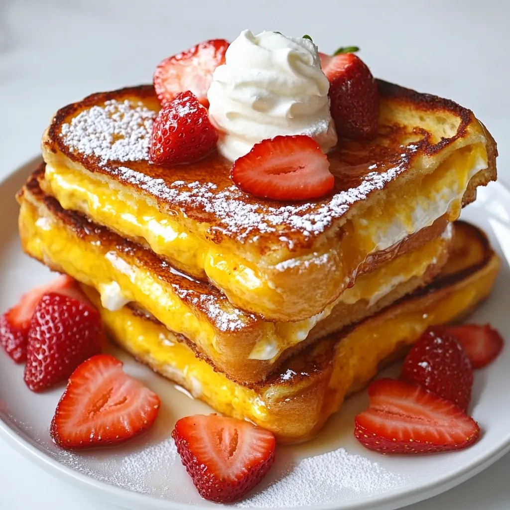 To make this tasty Strawberry Cheesecake French Toast, you need a few key items: - 4 slices of thick brioche or challah bread - 1/2 cup cream cheese, softened - 1/4 cup powdered sugar - 1 teaspoon vanilla extract - 1 cup fresh strawberries, hulled and sliced - 2 eggs - 1/2 cup milk - 1 teaspoon cinnamon - A pinch of salt - 2 tablespoons unsalted butter These ingredients give the dish its rich and creamy flavor. The brioche or challah bread adds a soft texture that works well with the creamy filling. You can make your French toast even better with these toppings: - Whipped cream - Extra strawberries - Maple syrup These toppings add sweetness and freshness. You can mix and match them to suit your taste. I love adding extra strawberries and a drizzle of maple syrup for a lovely finish! {{ingredient_image_1}} To start, grab a mixing bowl. In it, combine 1/2 cup of softened cream cheese, 1/4 cup of powdered sugar, and 1 teaspoon of vanilla extract. Use a hand mixer or a whisk to mix these ingredients until smooth and creamy. This step is key for the rich flavor you want. Once it reaches a nice texture, set it aside for later. Now, take another bowl and whisk together 2 eggs, 1/2 cup of milk, 1 teaspoon of cinnamon, and a pinch of salt. Make sure to mix well until everything blends together. This mixture will coat the bread, giving it that delicious French toast taste. Next, preheat your skillet or griddle over medium heat. Add 1 tablespoon of unsalted butter and let it melt, coating the surface. Take one slice of thick brioche or challah bread. Spread a generous layer of the cream cheese mixture on one side. Top it with sliced strawberries, then place another slice of bread on top to make a sandwich. Carefully dip the sandwich into the egg mixture. Ensure both sides get coated but avoid making it soggy. Place the sandwich on the skillet and cook for about 3-4 minutes on each side. Look for a golden brown color, which shows it’s ready. Repeat this with the other slices, adding more butter as needed. Once cooked, remove the French toast and slice each sandwich in half. Arrange them on a plate, topping with extra strawberries and a dollop of whipped cream. Enjoy this delightful treat! To prevent sogginess in your French toast, let the bread soak in the egg mix for just a moment. This keeps it from getting too wet. I like to dip each side of the sandwich quickly. For a golden color, cook on medium heat. Too high and the outside burns before the inside cooks. Flip the toast only when the first side is golden. Adding spices gives your French toast a boost. I like to use a pinch of nutmeg or a dash of cardamom. These spices add warmth and depth to the flavor. Using flavored cream cheese can change the game. Try strawberry or vanilla cream cheese for an extra kick. You can even mix in some lemon zest for a fresh twist! Pro Tips Choose the Right Bread: Using thick brioche or challah bread will give your French toast a rich flavor and fluffy texture. These breads soak up the egg mixture beautifully without getting too soggy. Prepare a Flavorful Egg Mixture: Whisking in cinnamon and a pinch of salt enhances the taste of the French toast. Don’t skip the cinnamon, as it adds warmth and depth to the dish. Cook at the Right Temperature: Make sure your skillet is preheated to medium heat. This ensures an even cooking process, resulting in a golden brown crust without burning. Presentation Matters: Dust the finished French toast with powdered sugar and add a drizzle of maple syrup. Garnishing with fresh strawberries and whipped cream not only makes it visually appealing but enhances the overall flavor. {{image_2}} You can switch up the fruit in your Strawberry Cheesecake French Toast. Using other berries or fruits can give you new flavors. Blueberries or raspberries work well. They add a tart taste that balances the sweetness. You can also use bananas or peaches for a different twist. Seasonal fruits are fun to try. In summer, use ripe cherries or blackberries. In fall, think about apples or pears. Each fruit brings its own taste and texture. This way, your dish stays fresh and exciting all year. If you need a gluten-free option, you can substitute the bread. Look for gluten-free brioche or challah. Many brands make tasty gluten-free bread. You can also use gluten-free pancakes for a fun change. When choosing gluten-free bread, check for texture. It should be thick enough to hold the filling. This will help you create a great sandwich. Your Strawberry Cheesecake French Toast will still taste amazing! After you enjoy your Strawberry Cheesecake French Toast, you may have leftovers. To keep them fresh, place the slices in an airtight container. You can store them in the refrigerator for up to three days. Make sure to let them cool completely before sealing the container. This way, they won’t get soggy. If you want to keep them for a longer time, freezing is a great option. Wrap each slice in plastic wrap or aluminum foil. Then, place the wrapped slices in a freezer bag. This method helps prevent freezer burn. You can freeze them for up to two months. Just remember to label the bag with the date. When it's time to enjoy your leftovers, reheating is easy. The best way to reheat Strawberry Cheesecake French Toast is in the oven. Preheat your oven to 350°F (175°C). Place the slices on a baking sheet and cover them with foil. Heat for about 10-15 minutes. This keeps them warm and crispy. You can also reheat them in a skillet. Heat a small amount of butter over medium heat. Add the slices and cook for about 2-3 minutes on each side. This method helps keep the outside crisp while warming the inside. Avoid using the microwave, as it can make the French toast soggy. Yes, you can prepare parts early. Mix the cream cheese, powdered sugar, and vanilla first. Store this filling in the fridge for up to two days. You can also slice the bread ahead of time. Just keep it in an airtight container. This way, you save time 