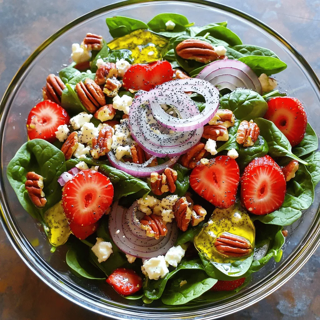 ![- Baby spinach - Fresh strawberries - Red onion The main part of this salad is the fresh produce. Baby spinach adds a nice crunch and a bright green color. I love using fresh strawberries because they bring sweetness and a pop of red. Slicing the strawberries lets their juice mix in with the salad. Red onion adds a bit of sharpness that balances the sweet strawberries. Together, these ingredients create a fresh and tasty mix. - Pecans - Feta cheese Next, we have the nuts and cheese. Chopped pecans give a nice crunch and a nutty flavor. They pair well with the sweetness of strawberries. Feta cheese adds creaminess and a salty kick. Crumbling the feta on top makes it easy to enjoy in every bite. These ingredients bring a variety of textures and flavors to the salad. - Olive oil - Apple cider vinegar - Honey, salt, and pepper Finally, we need the dressing components. Olive oil is the base of the dressing. It adds richness and helps mix everything together. Apple cider vinegar gives a tangy taste that brightens the salad. Adding honey brings a touch of sweetness, which balances the vinegar. Don’t forget to add salt and pepper to taste. This dressing ties all the flavors together perfectly. For the full recipe, check out the complete instructions. First, grab a small bowl. In it, whisk together the olive oil, apple cider vinegar, honey, salt, and pepper. Make sure these blend well to form a smooth dressing. Taste it and adjust the seasoning if you need more salt or sweetness. This dressing adds a sweet and tangy kick to your salad. Now, take a large salad bowl. Combine the washed baby spinach and sliced strawberries in it. Next, sprinkle in the chopped pecans, crumbled feta cheese, and thinly sliced red onion. Each ingredient brings its own flavor and texture. You will see bright colors and feel excited to eat this fresh mix. Drizzle your prepared dressing over the salad mixture. Use just enough to coat everything lightly. Gently toss the salad. This helps mix all the ingredients and dressing together. Finally, sprinkle poppy seeds on top. They add a delightful crunch and look beautiful. Serve the salad right away for the freshest taste. For detailed instructions, refer to the [Full Recipe]. When making Strawberry Spinach Poppy Seed Salad, I focus on fresh ingredients. Selecting ripe strawberries is key. Look for berries that are bright red with no green spots. They should smell sweet and feel firm but not hard. The taste of ripe strawberries adds a burst of flavor to the salad. Using fresh spinach is just as important. Choose baby spinach that is vibrant green and crisp. Avoid spinach that is wilted or yellowing. Fresh spinach serves as the perfect base. It pairs well with the sweetness of strawberries and the crunch of pecans. Presentation is important in this salad. I like to serve it in a large glass bowl. This way, the bright colors shine through. You can garnish with extra strawberry slices and a sprinkle of poppy seeds. This adds an elegant touch. Pairing the salad with protein can make it a meal. Grilled chicken or shrimp works well. Both add a nice contrast to the salad’s flavors. If you want something lighter, try adding sliced hard-boiled eggs. They provide protein without overpowering the dish. Prepping ingredients in advance makes serving easy. I often wash and slice the strawberries a few hours ahead. You can also chop the pecans and red onion early. Keep these in separate containers in the fridge. For storing salad components, I recommend using airtight containers. This keeps the spinach fresh and crisp. Don’t mix the salad until you’re ready to serve. This way, the salad stays crunchy and delicious. {{image_2}} You can make this salad even better with a few extra ingredients. - Adding grilled chicken: This option gives you added protein. Simply grill some chicken breast, slice it, and place it on top of the salad. It adds a nice touch and makes the dish more filling. - Incorporating other nuts or seeds: If you want a different crunch, try using walnuts or almonds. You can also swap in sunflower seeds for a nut-free option. Each choice gives the salad a unique flavor and texture. The dressing is key to this salad's success. You can switch it up for different tastes. - Balsamic vinaigrette: This dressing adds a sweet, tangy flavor that pairs well with strawberries. Just replace the olive oil and apple cider vinegar with balsamic vinegar, olive oil, and a dash of honey. - Yogurt-based dressings: For a creamy option, try a yogurt-based dressing. Mix plain yogurt with lemon juice, salt, and pepper. This gives the salad a rich taste, plus it's a bit lighter. You can easily adapt this salad to fit different diets. - Vegan alternatives: To make it vegan, skip the feta cheese and honey. Instead, try using a vegan cheese or avocado for creaminess. - Gluten-free options: This salad is already gluten-free! Just ensure that any dressings or added ingredients are also gluten-free. This way, everyone can enjoy it. For more ideas, check out the Full Recipe to explore all the options! To keep your salad fresh, store leftovers right away. Place the salad in an airtight container. This helps keep moisture out. Use a glass or plastic container with a tight lid. If you have dressing left, store it separately. This stops the salad from getting soggy. For long-term storage, you can freeze some parts. Freeze the pecans and feta cheese. Avoid freezing the spinach and strawberries, as they can get mushy. To maintain freshness, seal items in freezer bags. Remove as much air as you can. This helps prevent freezer burn. Knowing how long ingredients last is key. Fresh spinach stays good for about 5 to 7 days in the fridge. Strawberries last around 3 to 5 days. Check for signs of spoilage, like mold or squishy spots. If you see these signs, it’s time to toss them. Always trust your eyes and nose! For the full recipe, you can refer to the mentioned section. To wash spinach, start by filling a lar