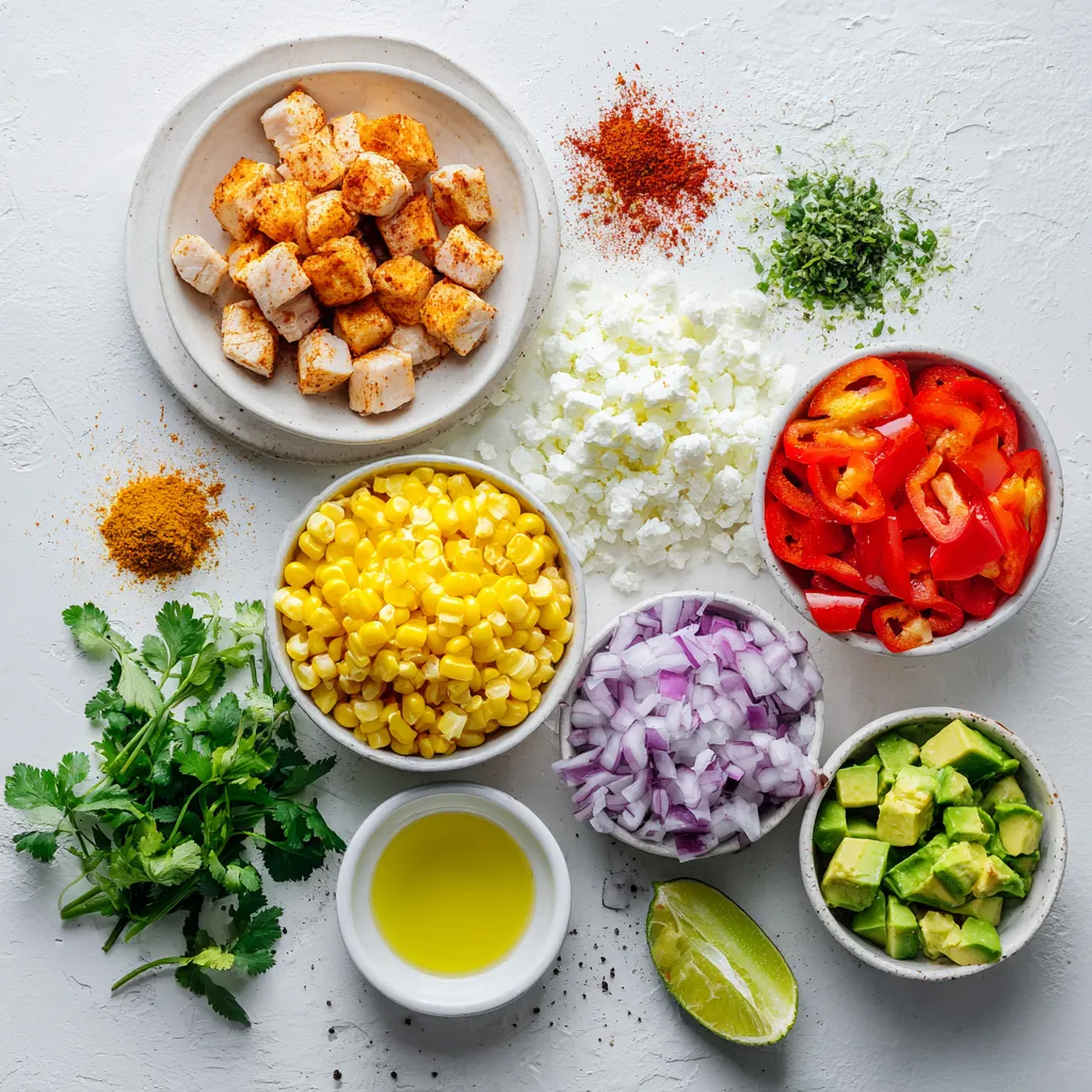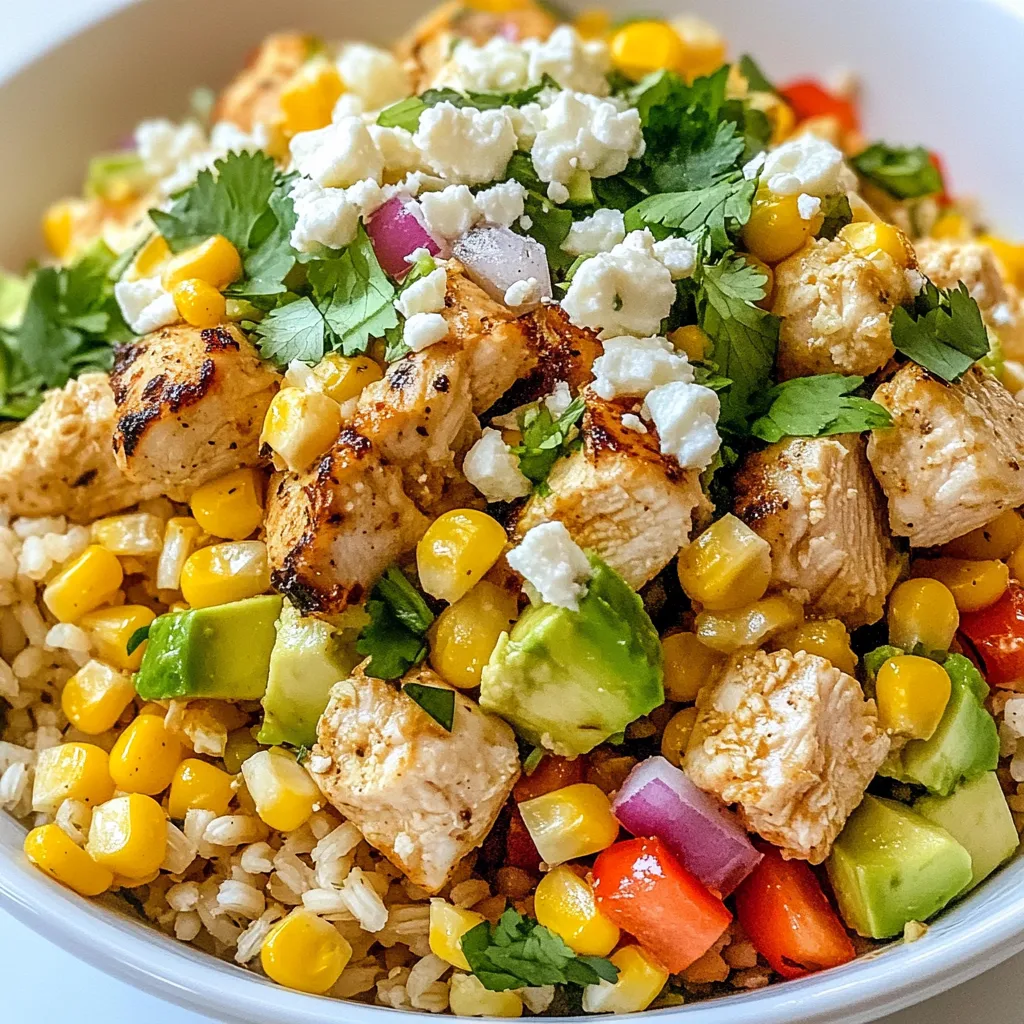 In this recipe, the main ingredients create a colorful and tasty bowl. Grilled chicken gives protein, while corn adds sweetness. The red bell pepper brings crunch, and avocado adds creaminess. Red onion gives a zesty kick, and feta provides a salty bite. Fresh cilantro brightens all the flavors.