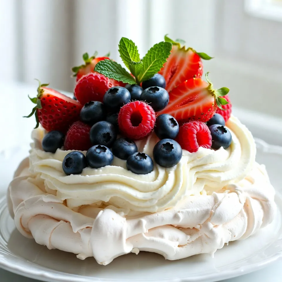 A light and airy meringue dessert topped with whipped cream and fresh mixed berries.