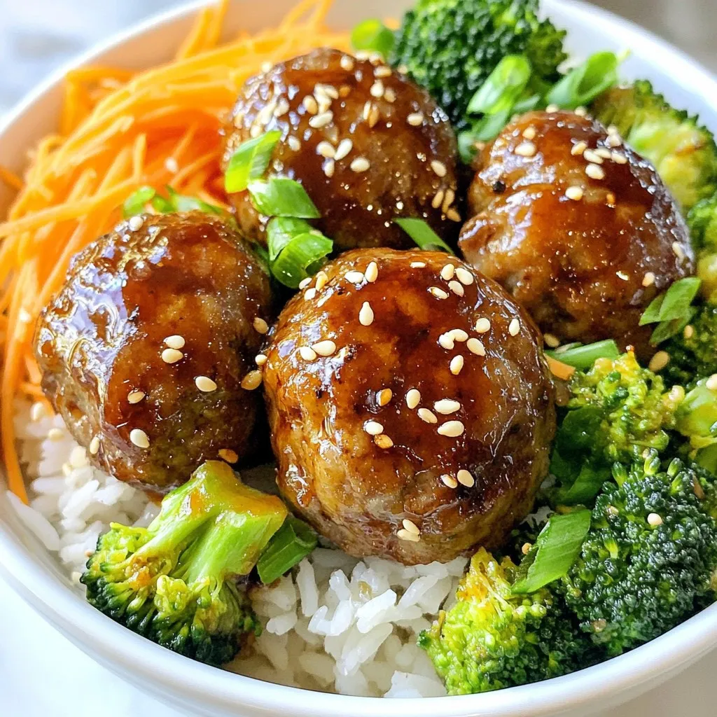 Arrange the bowls with bright colors in mind, layering the rice first, then adding the meatballs and vegetables artfully. Add an extra sprinkle of green onions for a pop of freshness.
