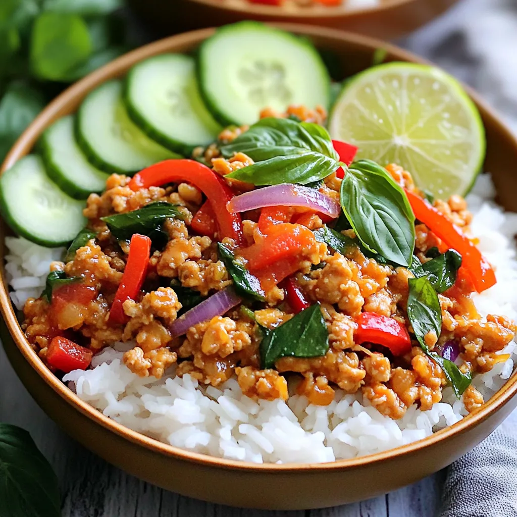 You can make a tasty vegetarian version of Thai Basil Chicken Bowls. Start by swapping ground chicken with tofu or tempeh. Both options absorb flavors well. Cut tofu into small cubes and press it to remove excess water. This helps it to brown nicely. For tempeh, slice it thin to allow quick cooking.