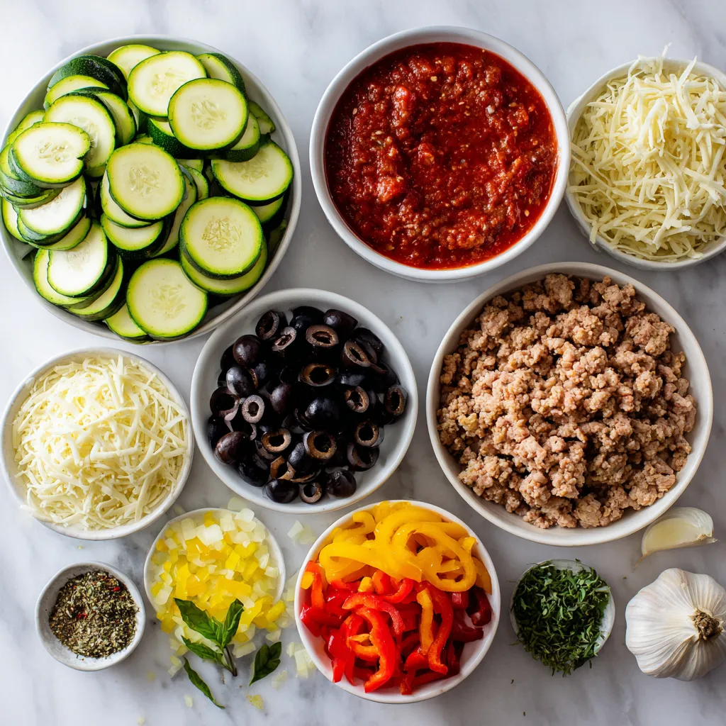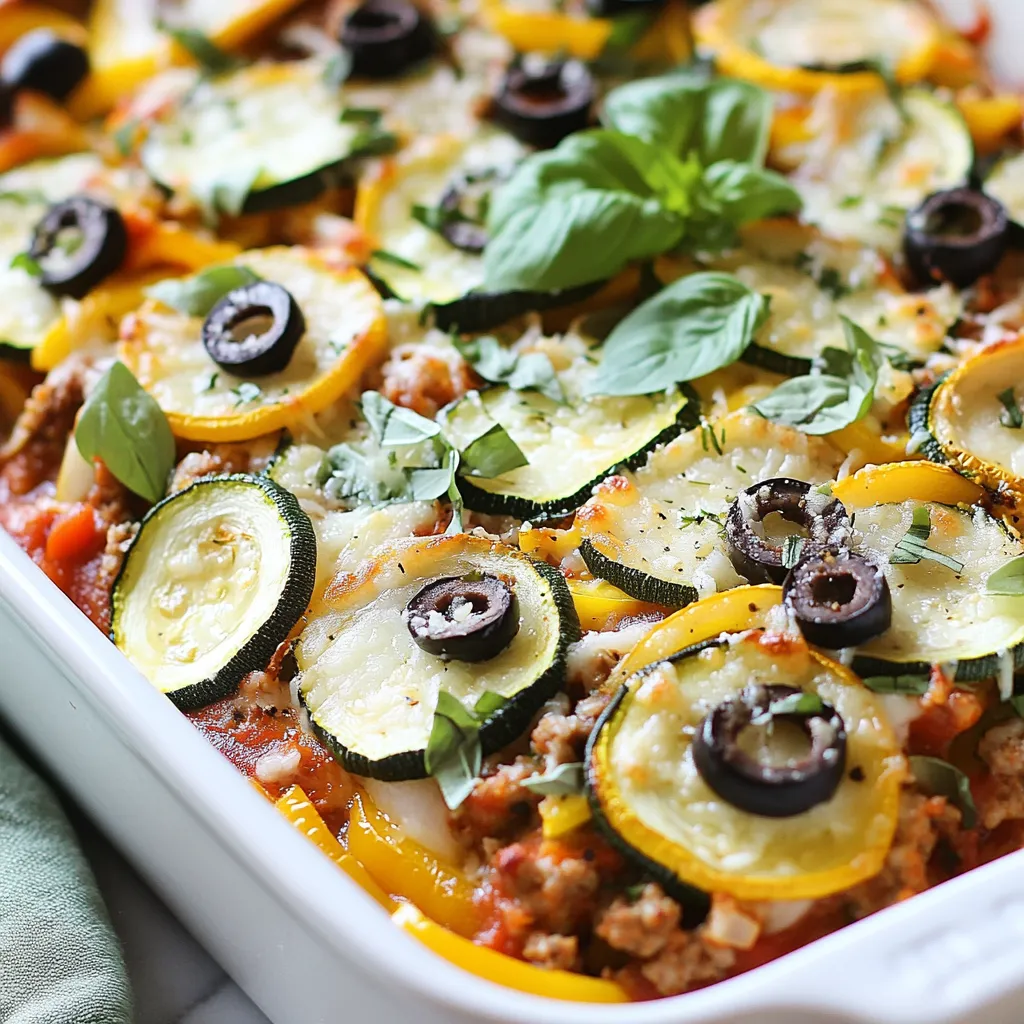 - 4 medium zucchini, sliced into thin rounds - 1 lb (450g) ground turkey or chicken - 1 cup pizza sauce (store-bought or homemade) The star of this dish is the zucchini. It gives a fresh taste and a nice texture. You slice the zucchini into thin rounds to allow for even cooking. Ground turkey or chicken adds protein and flavor. I prefer turkey for its lean quality, but chicken works well too. The pizza sauce ties everything together, forming a rich base full of flavor. - 1 cup shredded mozzarella cheese - 1/2 cup grated Parmesan cheese Cheese is key to this casserole! Mozzarella melts beautifully, creating that gooey texture we all love. Parmesan adds a sharp and salty kick on top. You can use more mozzarella or mix in your favorite cheese for a different taste. - 1/2 cup sliced black olives - 1/2 cup diced bell peppers (any color) - 1/2 cup finely chopped onion - 2 cloves garlic, minced For added flavor and nutrition, I like to use black olives and bell peppers. They bring color and taste. Onions and garlic create a savory base that enhances the dish. Feel free to add more veggies, like spinach or mushrooms, to make it your own. You can also skip the olives if they aren't your favorite. {{ingredient_image_1}} To start, you need to prep the zucchini. Slice four medium zucchinis into thin rounds. This helps them cook evenly. After slicing, sprinkle some salt on the zucchini and let them sit for about 10 minutes. This step helps draw out moisture, so your casserole is not soggy. Next, let's sauté the onions and garlic. In a large skillet, heat one tablespoon of olive oil over medium heat. Add half a cup of diced onion and two minced garlic cloves. Sauté them for about 3 to 4 minutes until the onions turn translucent. This step adds great flavor to your dish. Now, it's time to cook the meat. Add one pound of ground turkey or chicken to the skillet. Use a spatula to break it up as it cooks. Brown the meat for about 5 to 7 minutes until it is fully cooked. Season the meat with salt, pepper, one teaspoon of dried oregano, one teaspoon of dried basil, and half a teaspoon of red pepper flakes if you like a bit of heat. Mix it all well to ensure every bite is full of flavor. Let’s build the layers of the casserole. Start with your pizza sauce. Spread half of your one cup of pizza sauce on the bottom of a rectangular casserole dish. Now, layer half of the meat mixture over the sauce. Next, add half of the zucchini slices. Then, sprinkle half a cup of sliced black olives and half a cup of diced bell peppers. Top that with a third of a cup of shredded mozzarella cheese. Repeat this layering process with the remaining ingredients. Finish with the last of the pizza sauce and the rest of the mozzarella cheese on top. Finally, sprinkle half a cup of grated Parmesan cheese over everything for a rich, cheesy finish. Cover the dish with aluminum foil and bake it in a preheated oven at 375°F for 25 minutes. Remove the foil and bake for an additional 15 to 20 minutes, until the cheese is bubbly and golden brown. Let the casserole cool for about 5 minutes before slicing it into squares. Enjoy your tasty zucchini pizza casserole! To get the best texture, start by removing excess moisture from the zucchini. Zucchini has a lot of water. If you don't remove it, your casserole may turn out soggy. After slicing the zucchini, sprinkle it with salt. Let it rest for about 10 minutes. This draws out the moisture. Then, gently pat the slices dry with a paper towel. This step is key to keeping your casserole firm. To prevent a soggy casserole, layer your ingredients wisely. Start with a layer of pizza sauce at the bottom. This helps create a barrier that keeps moisture away from the zucchini. Also, don’t overcook the zucchini. It should still have a little crunch before baking. For a tasty kick, add spices and herbs like oregano and basil. These herbs will bring out the flavor of the zucchini and meat. I also suggest adding garlic for a savory touch. If you like a bit of heat, sprinkle some red pepper flakes. This small addition can make a big difference. You can also add extra ingredients for more flavor. Chopped bell peppers add sweetness and color. Sliced black olives bring a salty bite. Consider adding mushrooms or spinach if you want extra veggies. These options help create a rich taste. Presentation matters. To serve the casserole, cut it into squares. Place them on a nice plate for a lovely look. You can garnish with fresh basil leaves. This adds a pop of color and freshness. Drizzling a bit of extra pizza sauce around the edges makes the dish even more inviting. You can also sprinkle some extra cheese on top before serving. These small touches make your casserole stand out and taste even better. Pro Tips Layer Wisely: Ensure that you layer the ingredients evenly to prevent any sogginess and allow for even cooking throughout the casserole. Use Fresh Herbs: For an extra burst of flavor, consider adding fresh basil or oregano to the layers right before serving. Experiment with Toppings: Feel free to customize your casserole by adding your favorite pizza toppings, such as pepperoni, mushrooms, or spinach. Let it Rest: Allow the casserole to cool for a few minutes after baking; this helps it set and makes it easier to cut into neat squares. {{image_2}} You can make this casserole vegetarian by swapping the meat. Use lentils, chickpeas, or diced tofu. These options add protein and flavor without meat. You can also add more veggies. Spinach, mushrooms, or zucchini flowers work well. Mix and match to find your favorite combo. For a gluten-free version, check your pizza sauce. Many brands are gluten-free, but read the label. You can also try making your own sauce. Blend tomatoes, garlic, and herbs for a fresh taste. For cheese, use dairy-free cheese or nutritional yeast. Both options melt well and keep the dish creamy. If you want a low-carb dish, use cauliflower instead of zucchini. Grate it to create a rice-like 